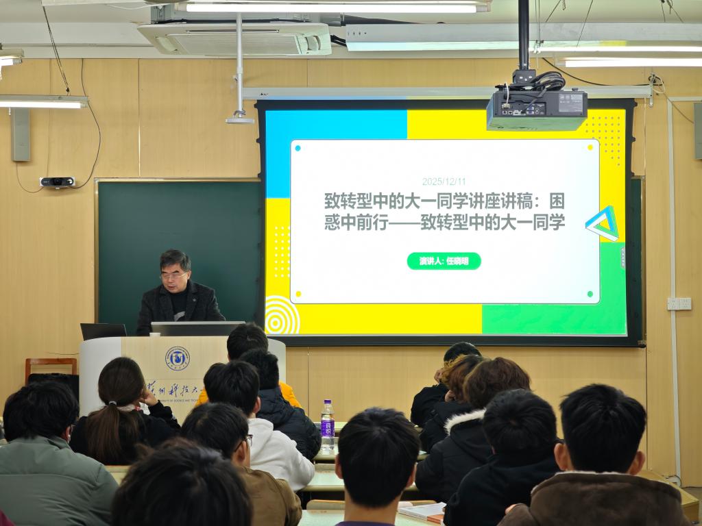 发布日期:2025-12-18 浏览:次12月11日,土木工程学院特邀校关工委委员任晓明为2025级“钱七虎卓越班”新生开展“困惑中前行”主题讲座,聚焦大学生学业与心理转型关键期的发展指导。讲座由班级“薪火·铸盾导师”席学军主持。 任晓明在讲座中重点阐述了大一新生面临的学习转型挑战与应对策略。他指出,从高中到大学的过渡是一个系统性转型过程,学业表现的波动在此阶段实属正常。其深层原因主要在于学习模式从“被动接受”转变为“主动探索”,加之阶段性目标模糊与自我管理能力尚在构建之中。 他以工科数学分析为例,具体阐释了高效学习方法。该课程知识点密集、进度快、题型综合性强。他建议以“函数”概念为核心,系统掌握复合函数、隐函数、反函数、初等函数、分段函数等各类函数的性质(如定义域、值域、周期性),并熟练运用它们进行求极限、求导、求积分等运算。关键在于多练习、勤反思,通过整理个性化易错题和绘制章节思维导图来深化理解。
