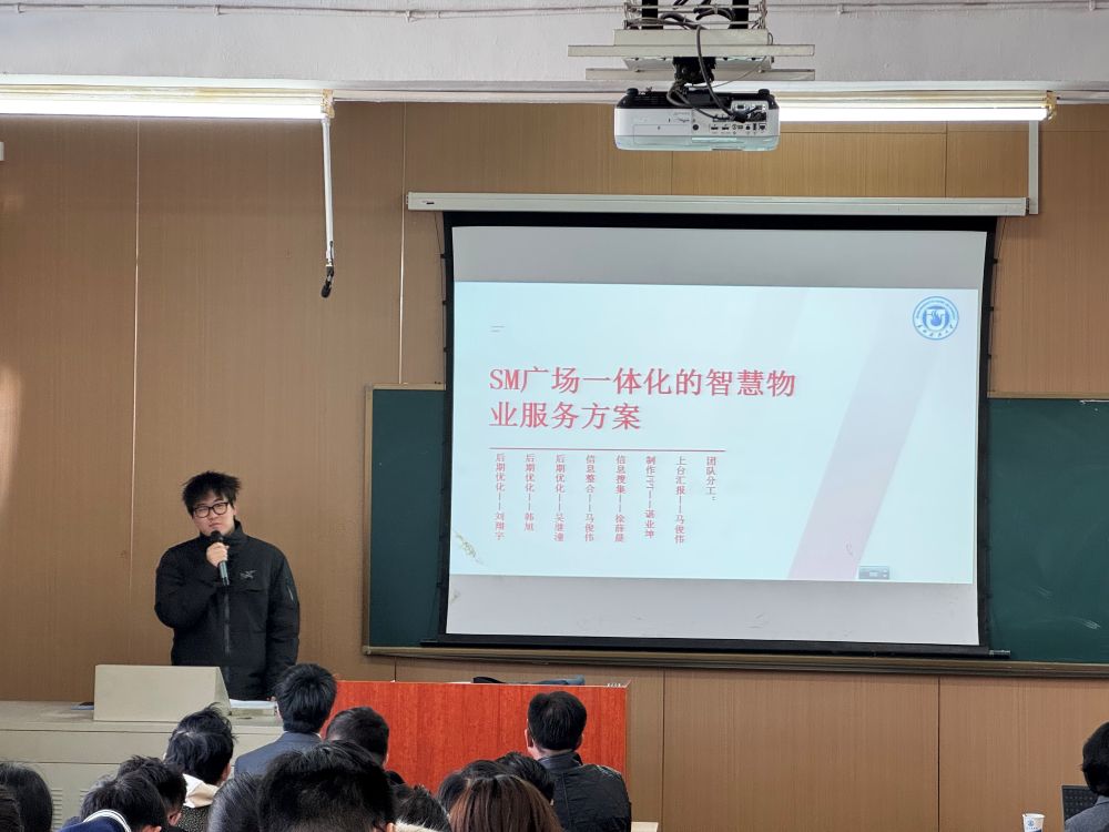 作者:田鹏许、吴芳 图片作者:吴芳 来源:土木工程学院 发布日期:2025-11-25 浏览:次2025年11月21日周五3-4节,江枫校区J7教室气氛热烈,23级工程管理专业学生以饱满的热情展示并汇报了各自的物业服务策划方案。由苏州华心科技服务集团(后简称华心集团)的高管队伍组成的专家评委们以专业视角给予细致点评与指导,现场掌声不断。多位评委在精彩方案的感染下,主动走上讲台,近距离给予赞誉与建议,将课堂氛围推向高潮。此次展示标志着工程管理系与华心集团合作的产教融合课程——《房地产概论》物业服务模块首次授课顺利结课。