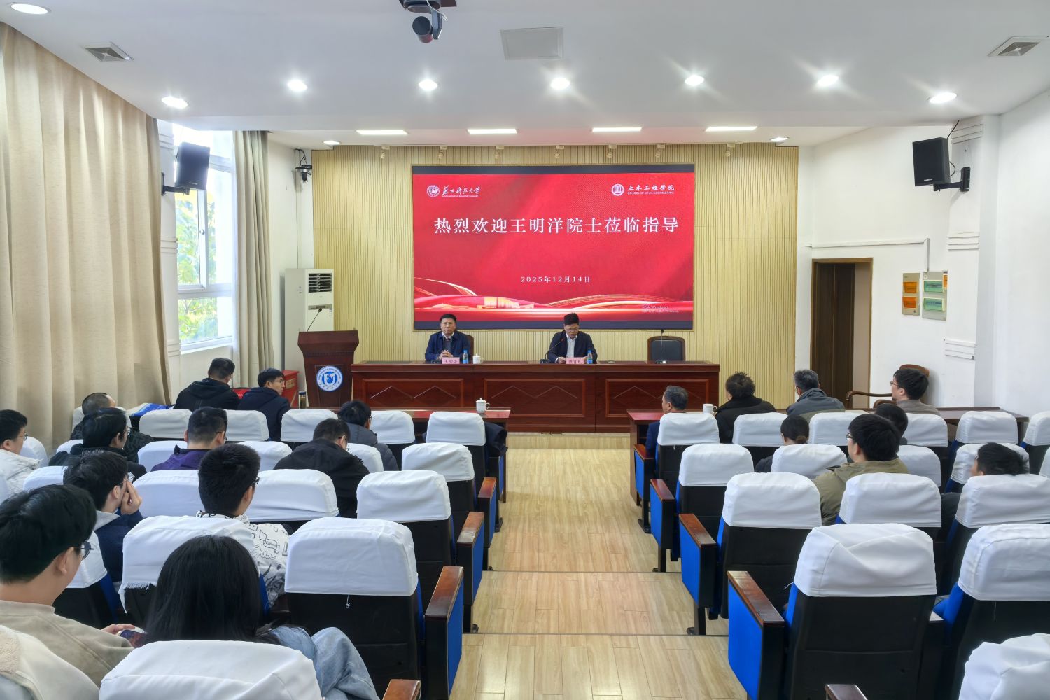 作者:郭凡 图片作者:郭凡 来源:土木工程学院 发布日期:2025-12-16 浏览:次2025年12月14日,苏州科技大学举办土木工程学科高质量发展系列活动。我国工程防护领域著名专家、中国工程院院士王明洋应邀来校,作“现代战争下关键基础设施防护若干理论问题”的学术报告,并出席土木工程学科高质量发展研讨会。校党委书记姜朋明,党委常委、副校长唐柏鉴等参加活动。