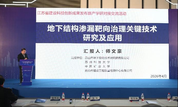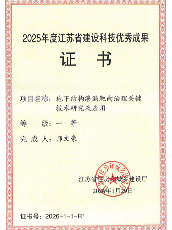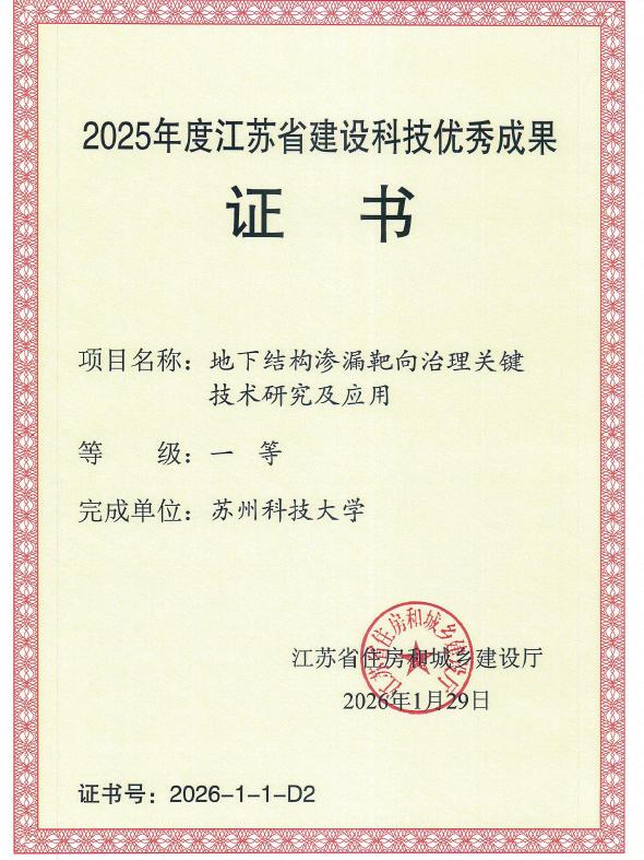 我院与共建江苏省研究生工作站的产学研合作创新成果“地下结构渗漏靶向治理关键技术研究及应用”荣获2025年度江苏省建设科技优秀成果一等奖,并受邀作大会专题汇报。该成果突破地下结构渗漏治理技术瓶颈,兼具创新性与实用性,得到与会专家与企业代表的高度认可。