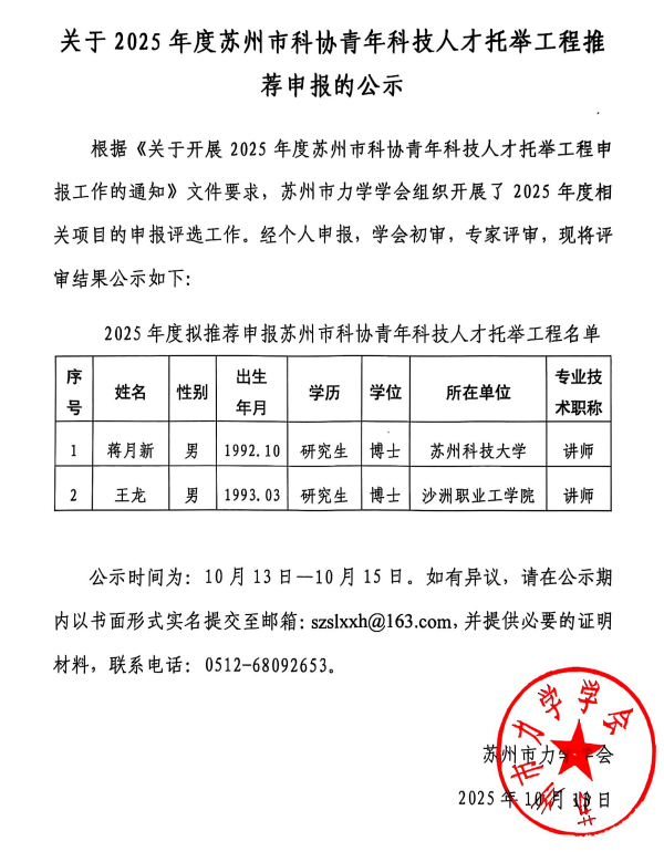 关于2025年度苏州市科协青年科技人才托举工程推荐申报的公示
